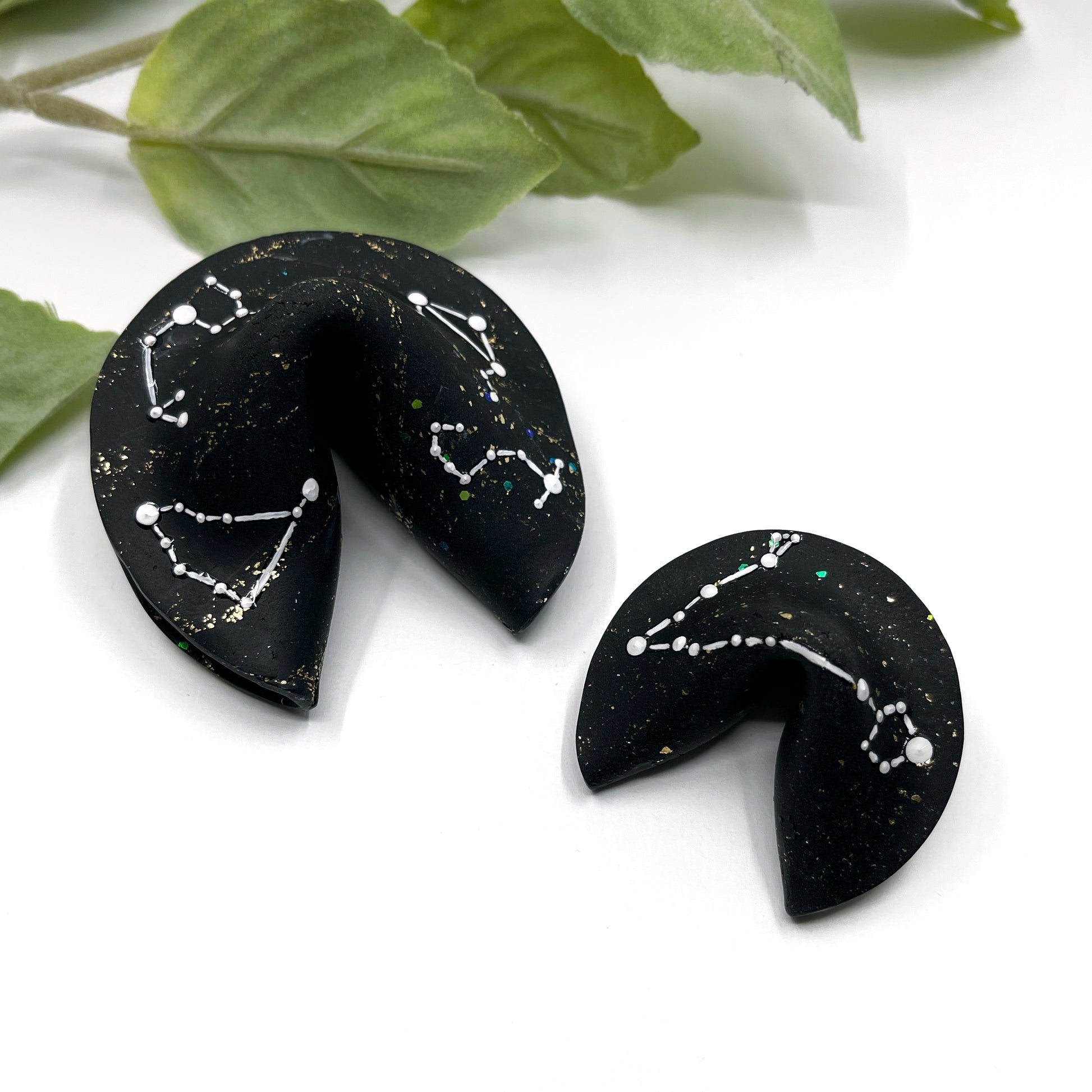 Polymer clay reusable fortune cookie sculpture with a sparkly constellation print with the star signs of your choosing!
