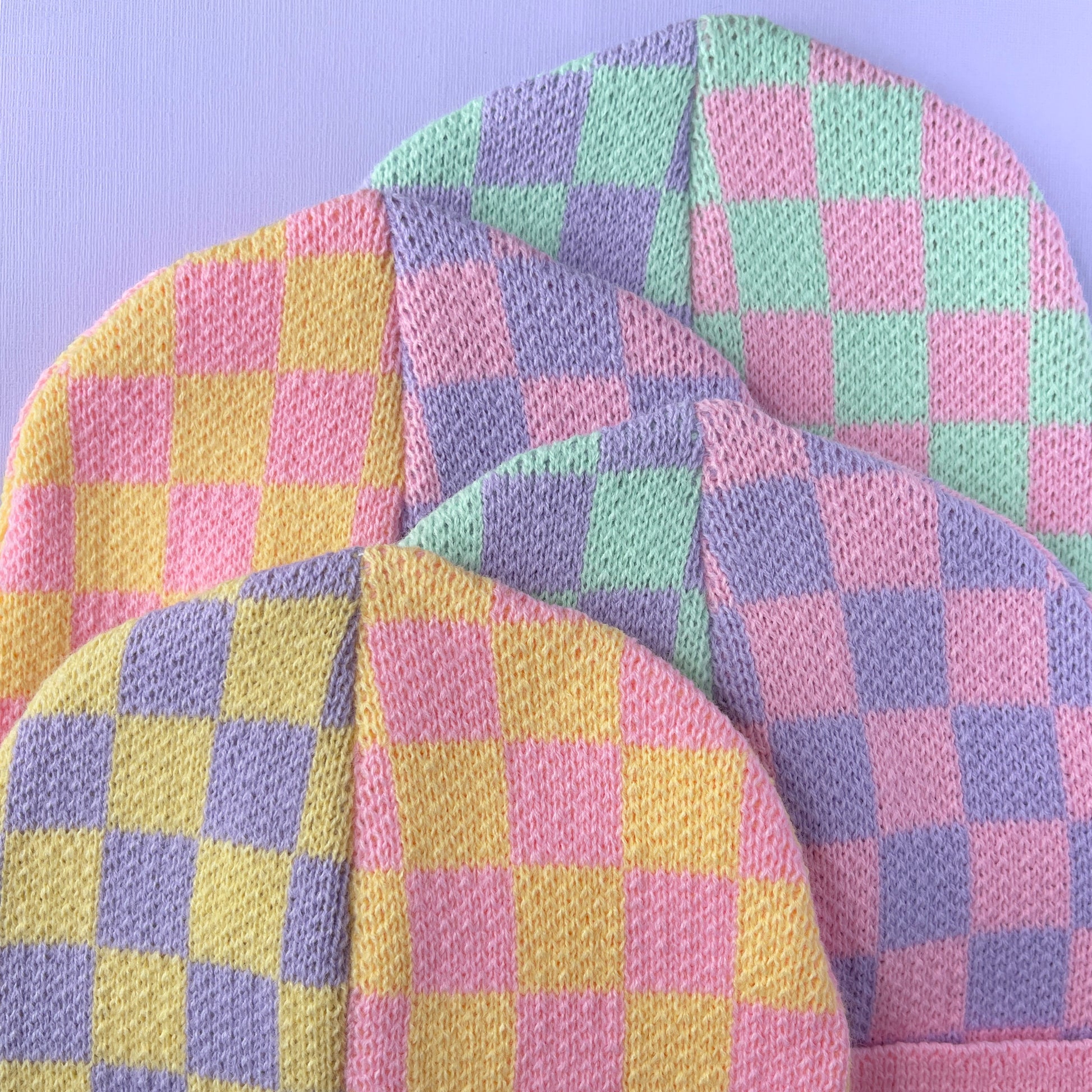 Our half and half checkerboard beanie hats are simply perfect for everyone who loves keeping their heads warm whilst looking insanely cool. Designed by Emu herself and machine knitted in our studio. Each one is made to order so will be lovingly created just for you! This is the smaller print half and half version of our checkerboard beanies, for the plain check and larger print checks see our products "Check Beanie" and "Large Check Beanie".
