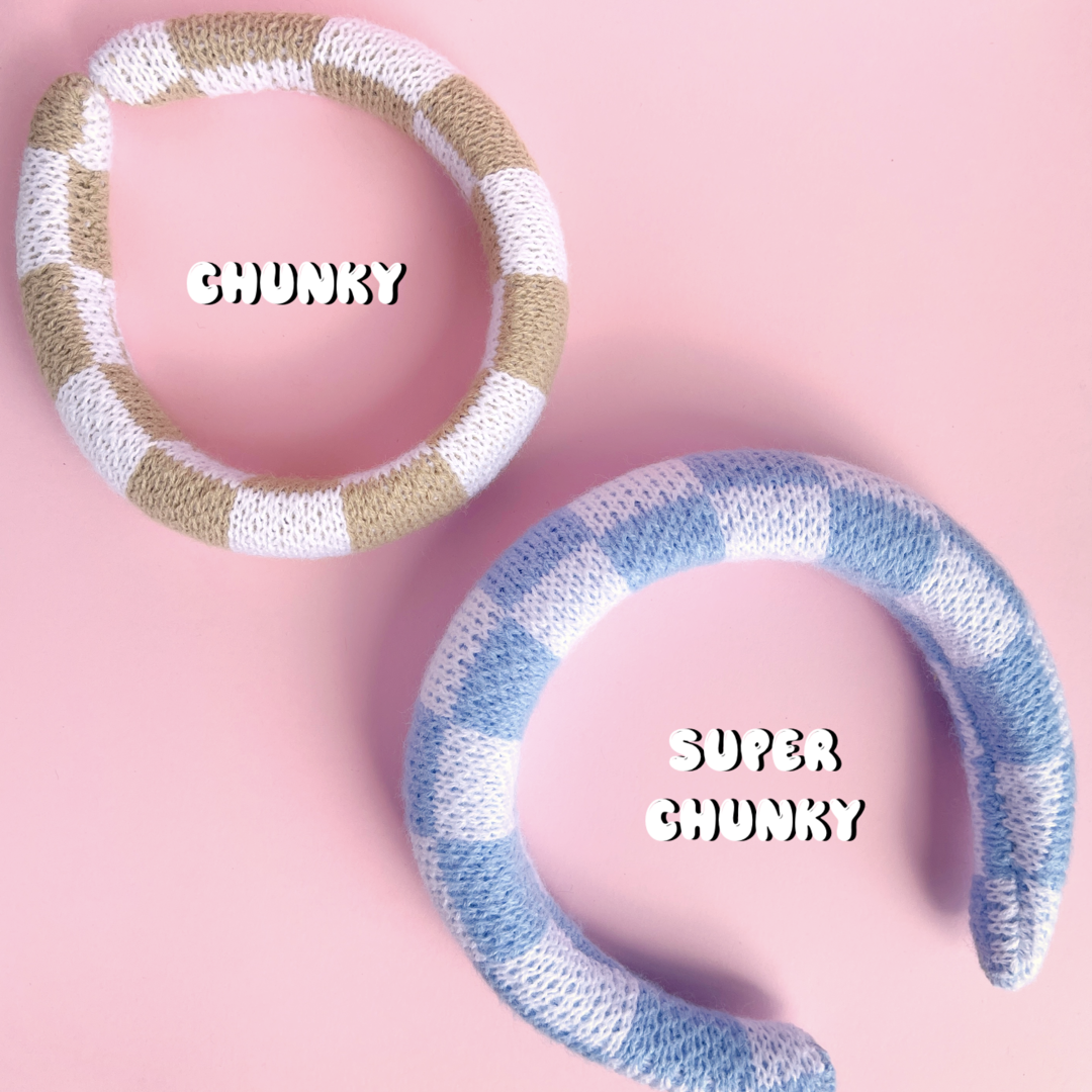 Our checkerboard hairbands are simply perfect for everyone who loves looking cute and staying stylish, made in 2 different chunkiness levels to suit every noggin! We suggest the chunky size for an every day look and the super chunky size for more of a halo, Anne Boleyn, statement moment (or if you have a lot of hair).