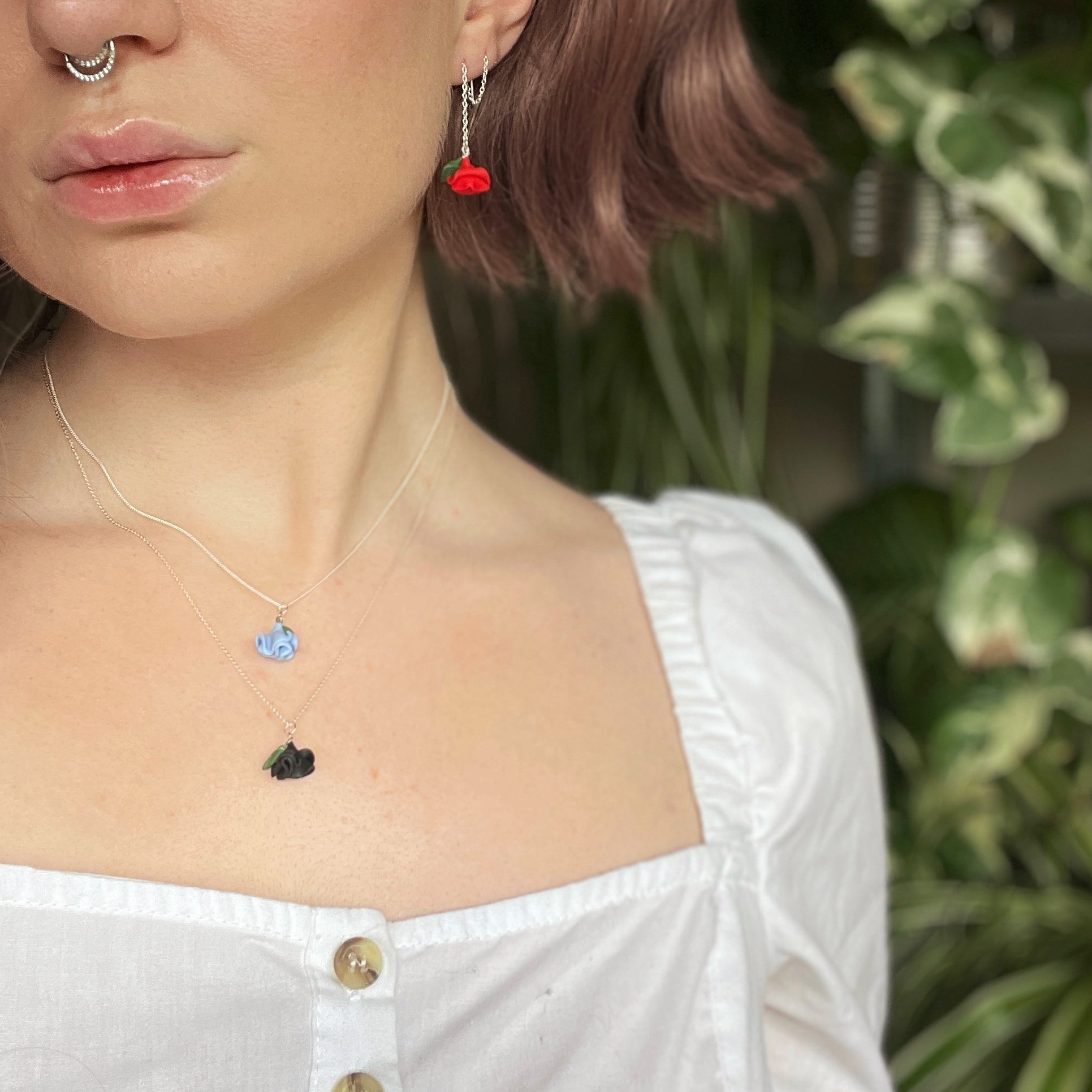 Lightweight polymer clay roses in the colour of your choice sit next to a tiny marbled leaves on a pair of threader chains. Perfect for all you ghouls no matter how many piercings you have! Either thread it through once for a classic double dangle look, or pop it through your 2nd and maybe even your 3rd piercings to give a wrap around, shorter style.