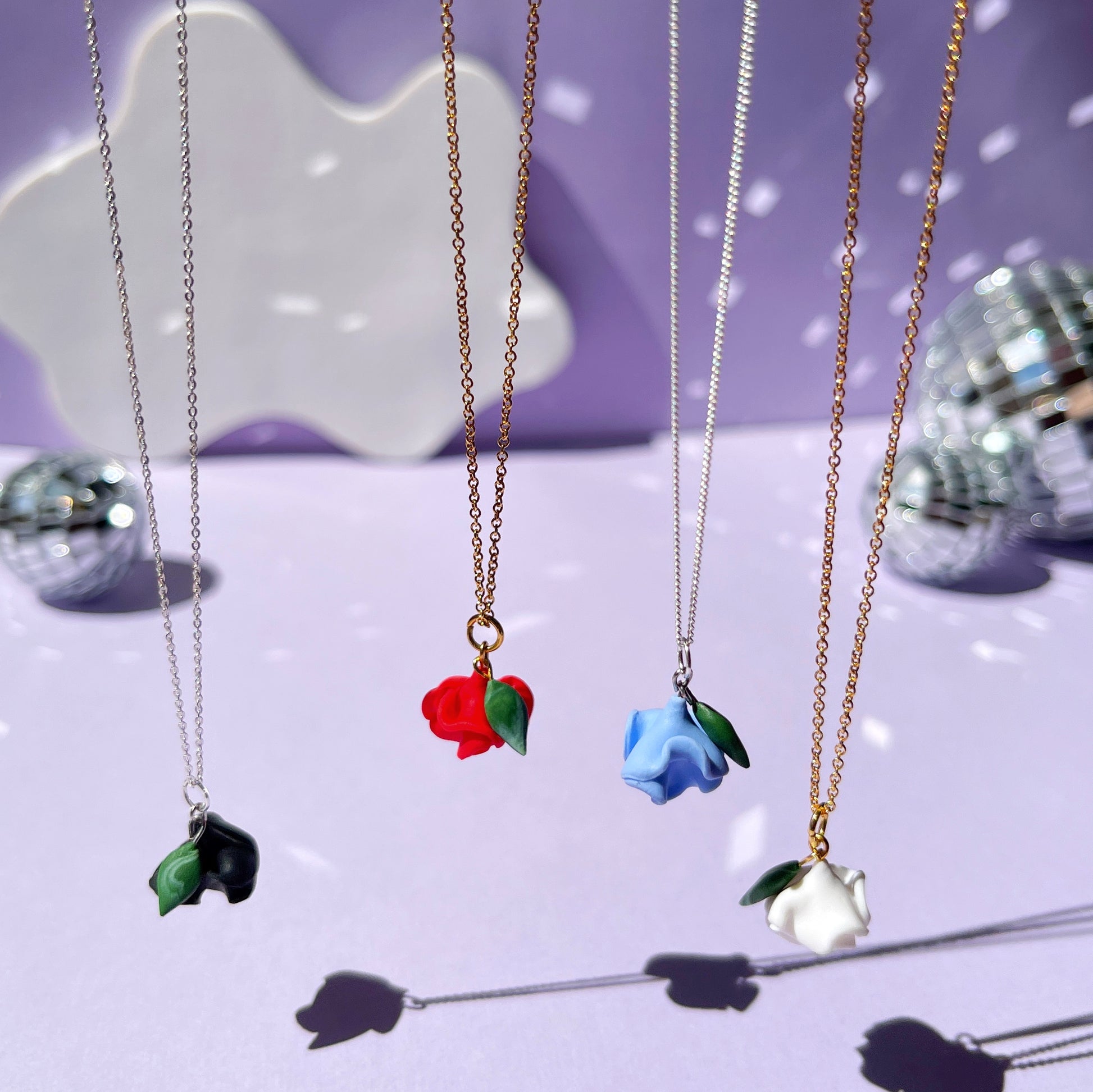 A lightweight polymer clay rose in the colour of your choice sits next to a tiny marbled leaf threaded onto a chain. These perfectly pair with our matching earrings and can be bought in either gold or silver!