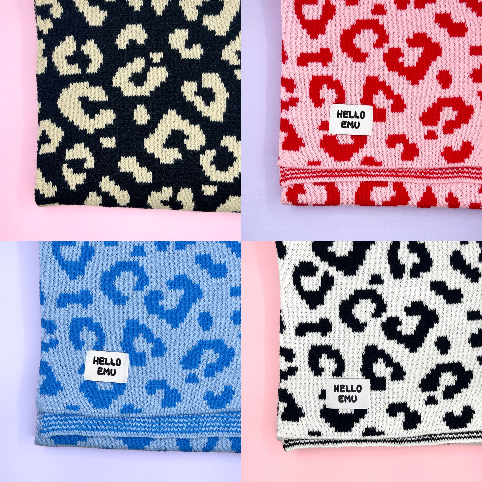 Our leopard print scarves are simply perfect for everyone who loves keeping warm whilst staying stunning. Designed by Emu herself and machine knitted in our studio, each one is made to order so will be lovingly created just for you!