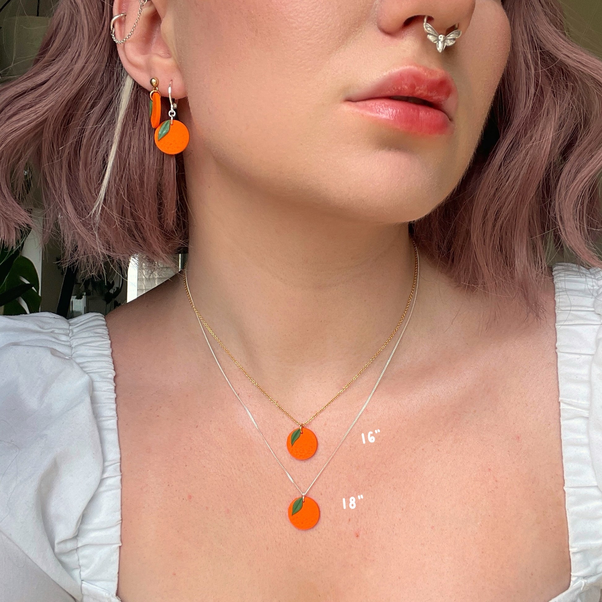 A lightweight polymer clay orange sits threaded onto a delicate sterling silver or gold filled chain. These look so beautifully quirky yet delicate when on and pair perfectly with our matching earrings!